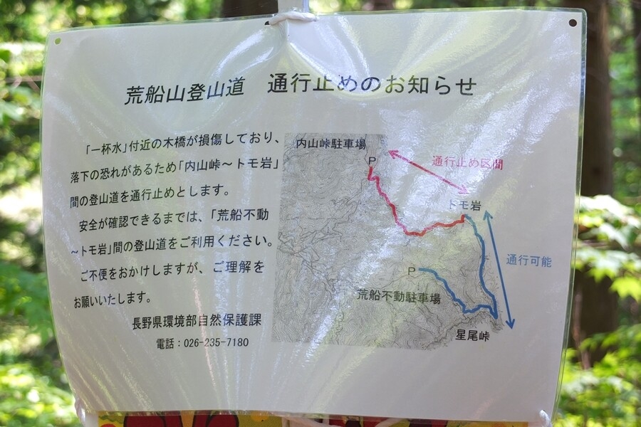 直前の情報で、内山峠からの道が途中の一杯水付近の木道が損傷し危険なため通行止めに。
