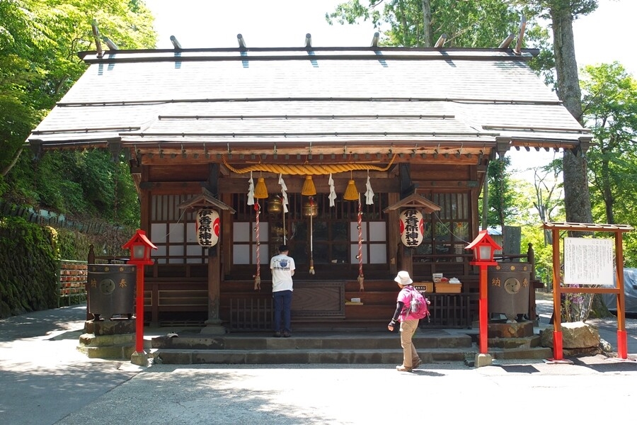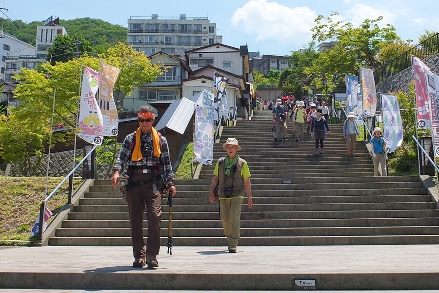 ロープウェイの駅から伊香保神社に向けて急な階段状の道を下る。