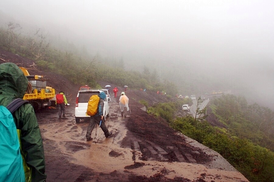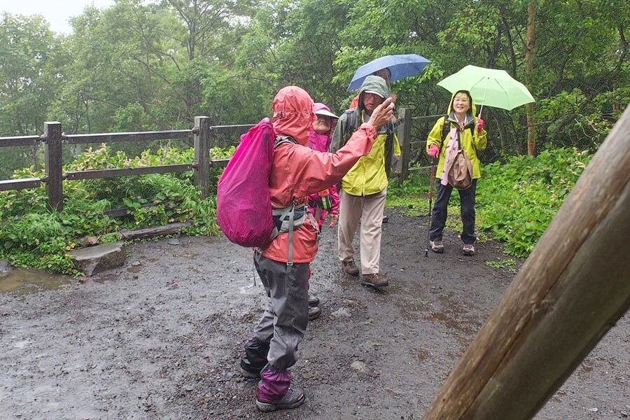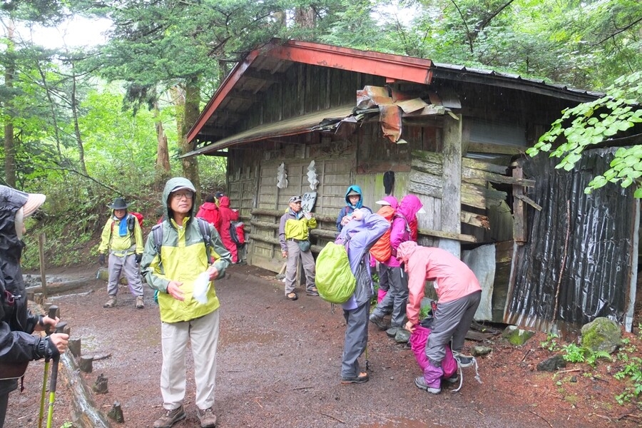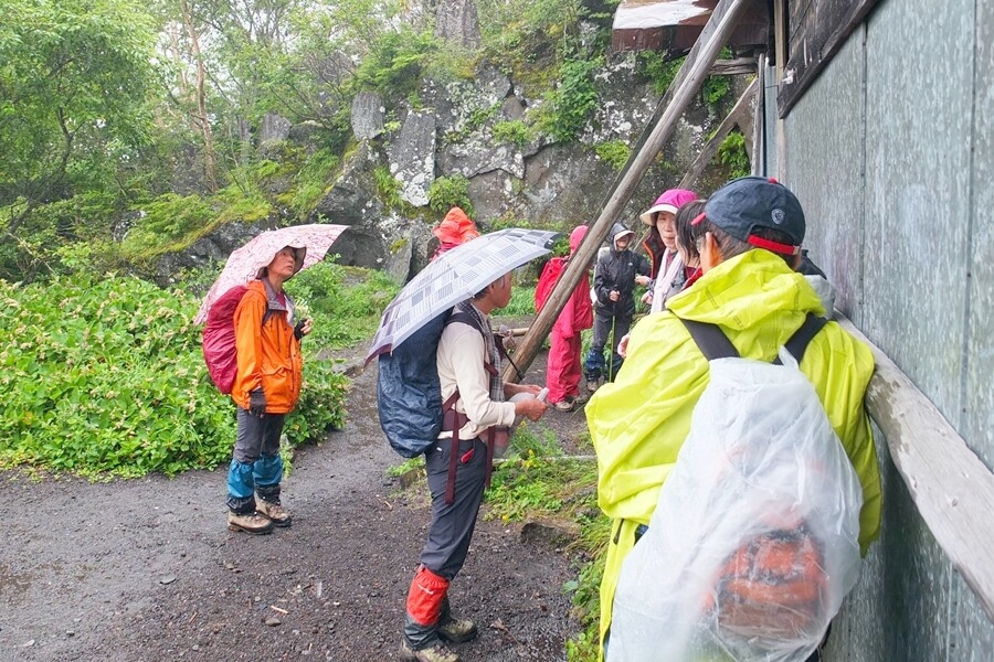 ところがこの日は南の海に台風が3個発生し、雨の隙間を期待しながら歩き始めましたがどんどんひどくなり、五合目到着時には全員ずぶ濡れ状態でした。