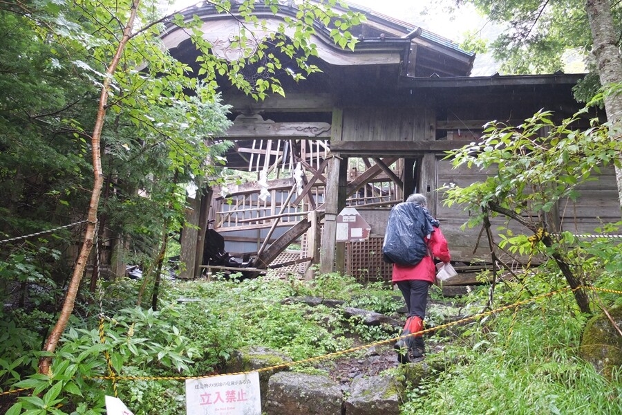 四合目はあまり見所もなく四・五合目の宿の跡へ、軒下に逃げ込んで撮影