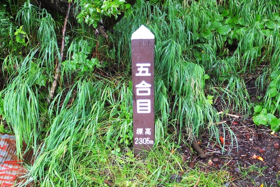 増水した林道を越えた所に五合目の標識があり、この上にある佐藤小屋へ更に向かう