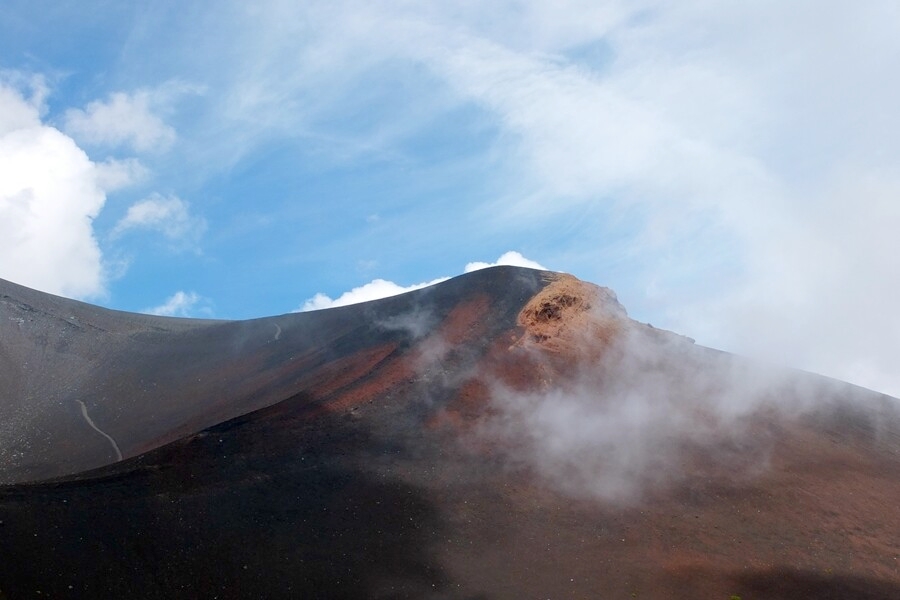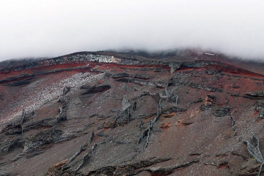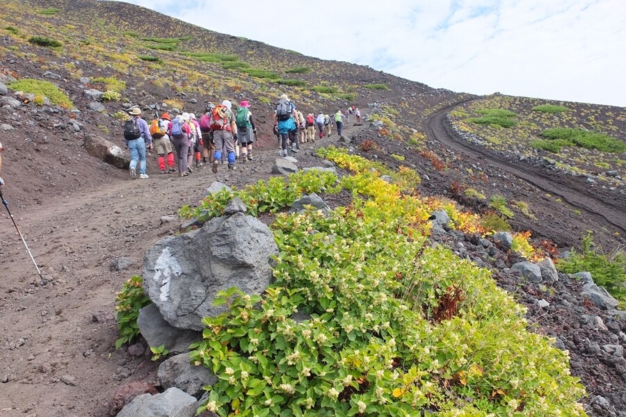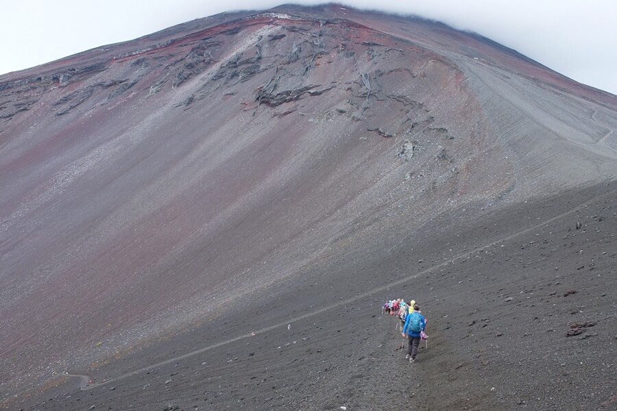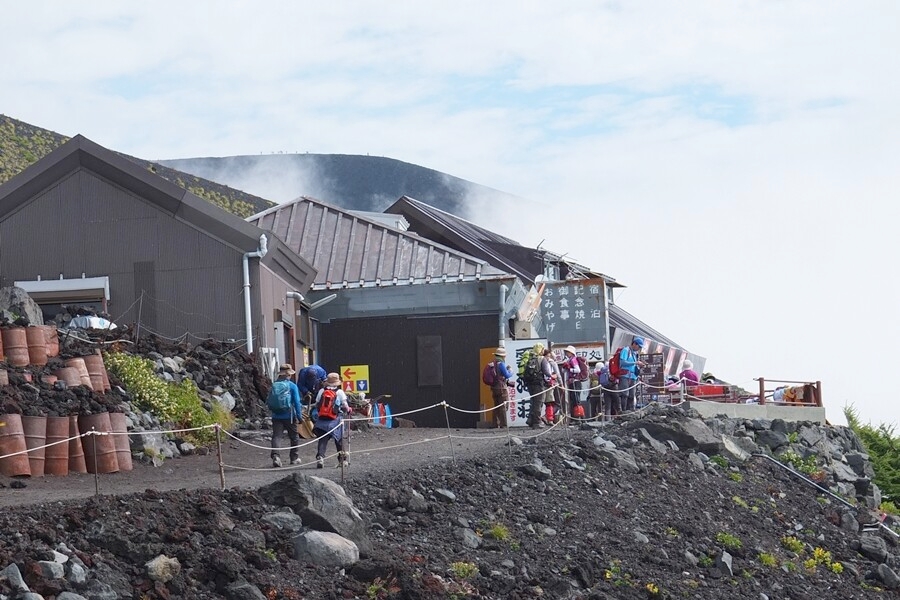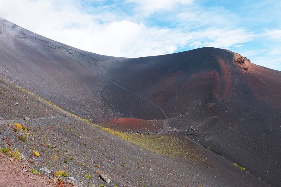 富士山頂方向も見えます。もう少し登ると途中に山小屋が見えます。7合目か8合目か