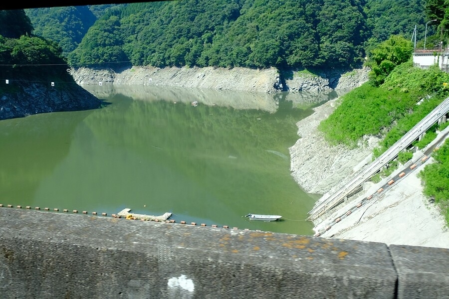 バスに立ったまま山道を揺られて三峯神社へ向かう途中で車窓から秩父湖を望む