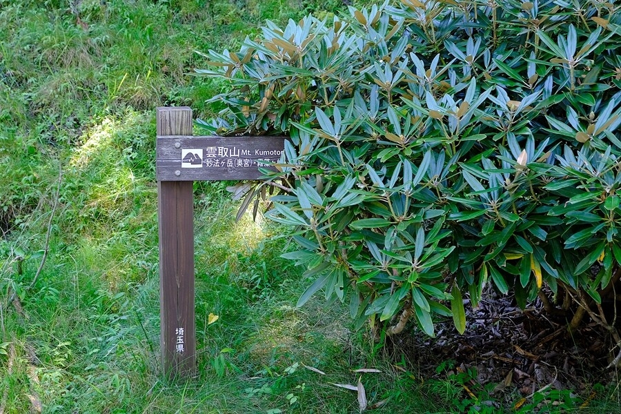 直ぐ神社からの道に交差してシャクナゲの木の脇にある道標に従い進む