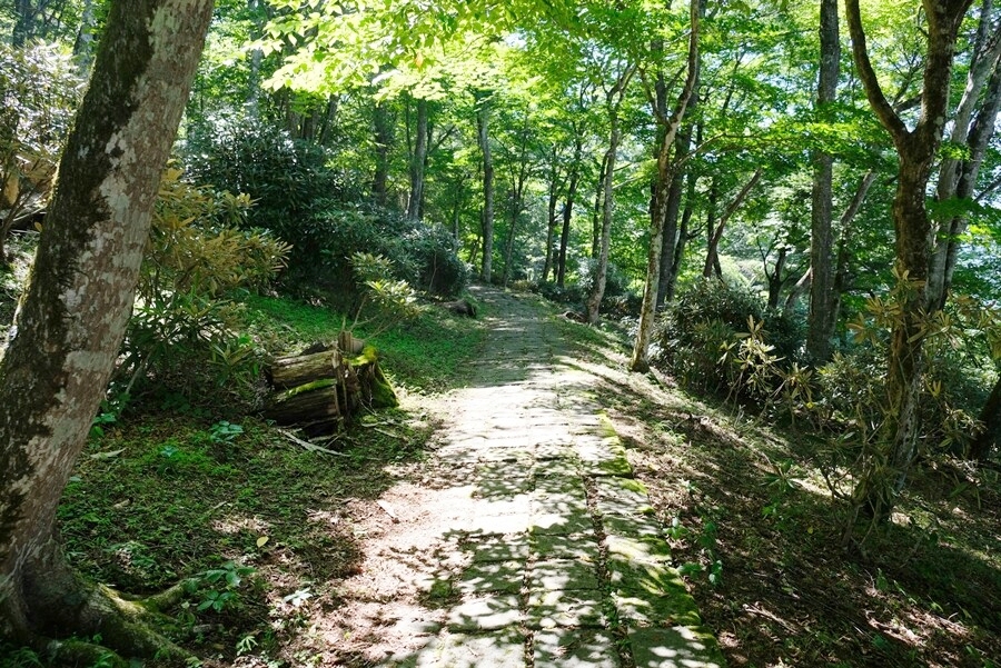 木陰の石畳の参道を行く