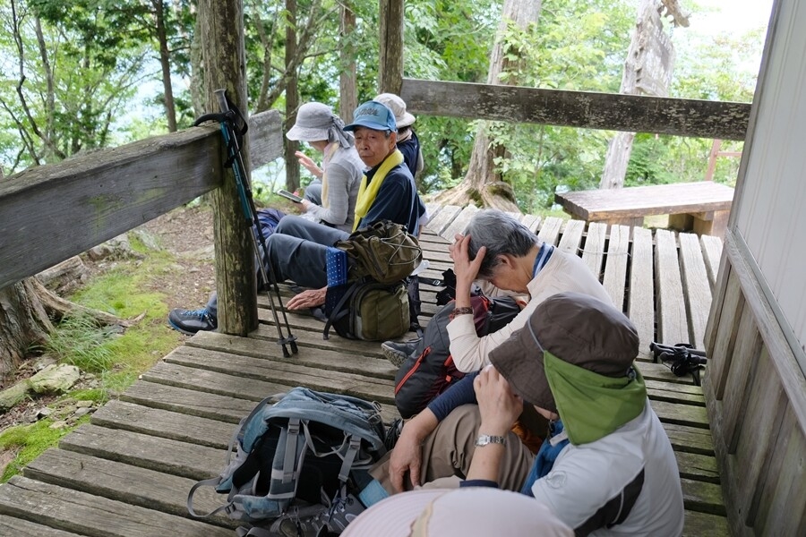 茶屋の日影で昼食タイム。風が抜けて涼しい。