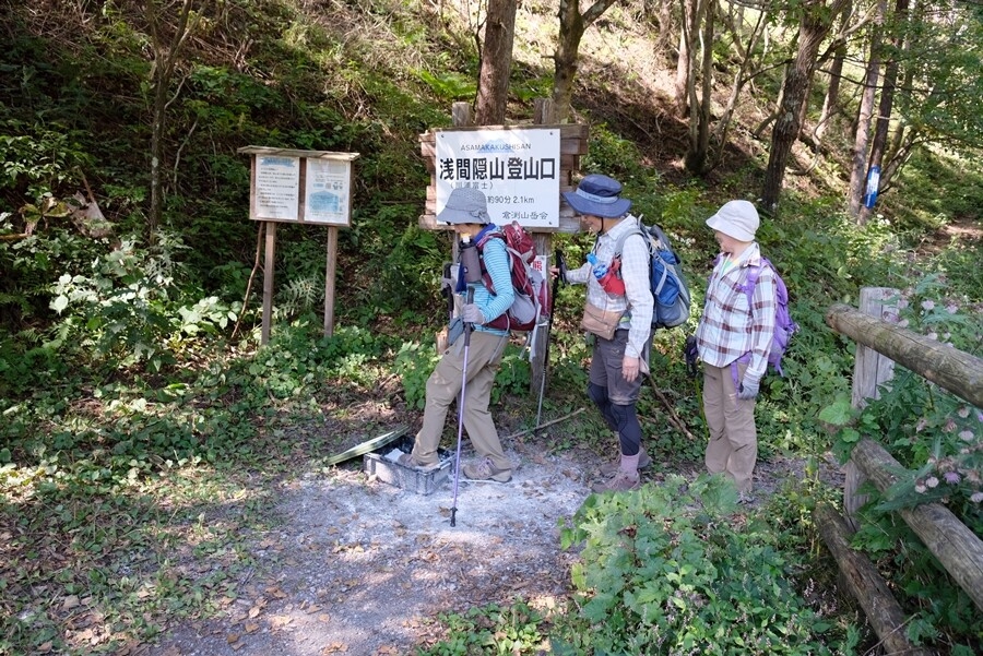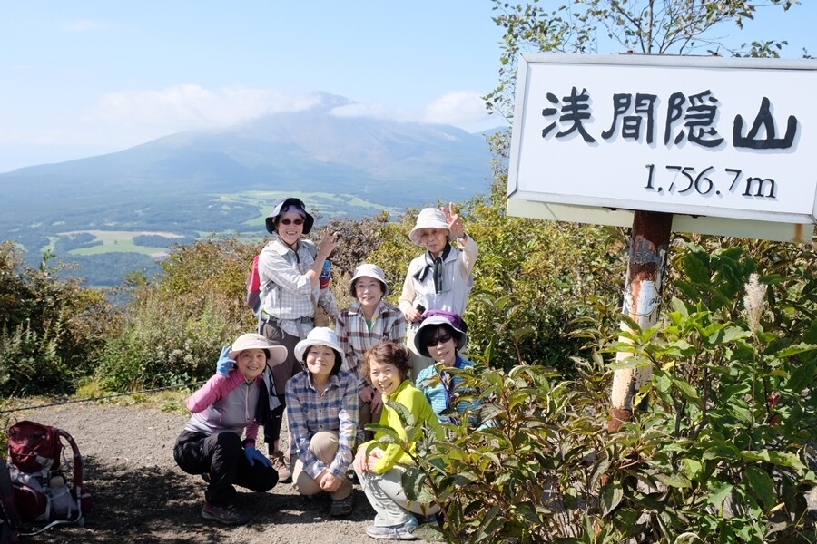 山頂看板を入れて浅間山をバックに記念撮影。