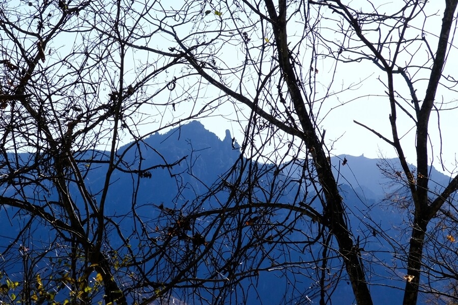 振り返ると樹間に瑞牆山がシルエットで見えている。