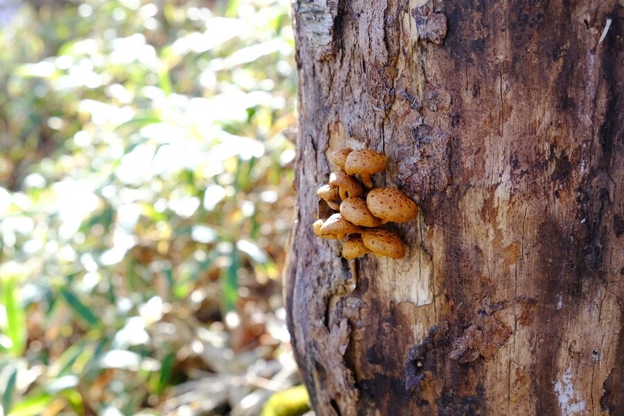 立木の途中からキノコが生えている。
