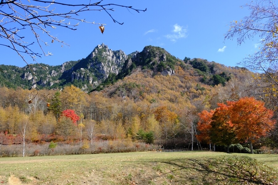 カヤトの原から茅が岳方面と手前の紅葉を見る。