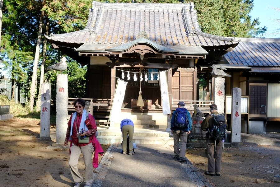 歩き始めは寒かったがこの頃には暑くなり、着衣調整を兼ねて神社にお参り9:50分