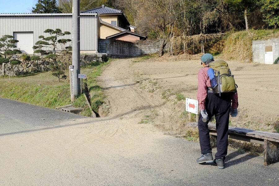 舗装道路から離れて、農家の脇を小高い山に入る。10:10分