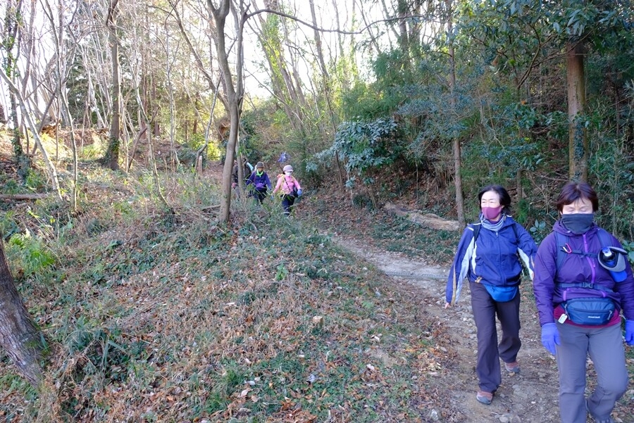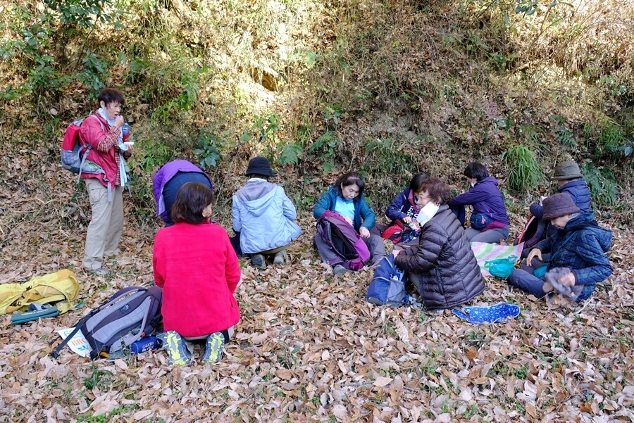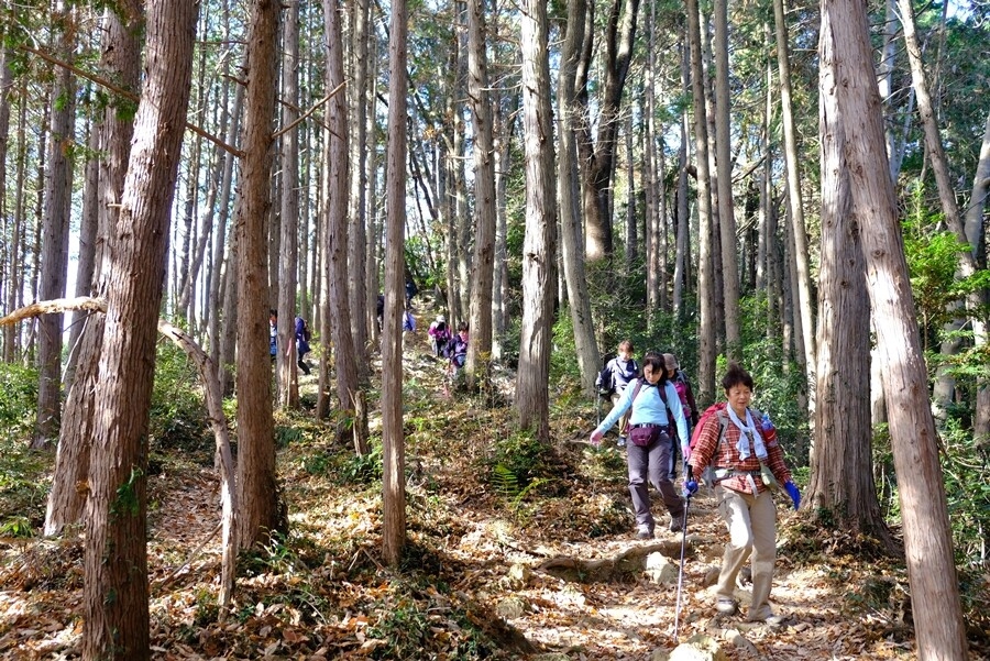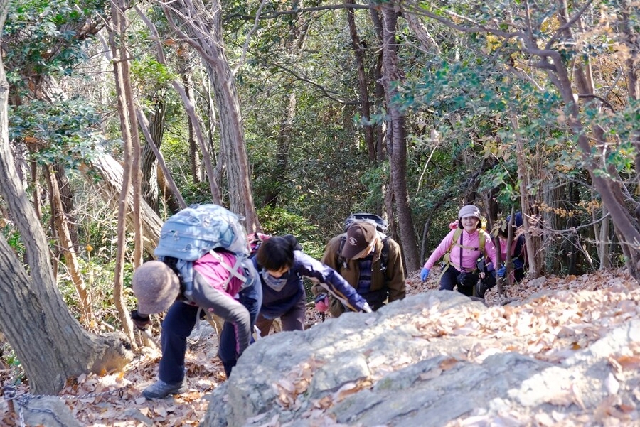 落ち葉で岩の具合が良く見えない所を注意して登る。
