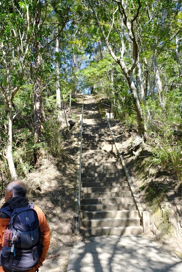 神社へ行くには急階段が続く