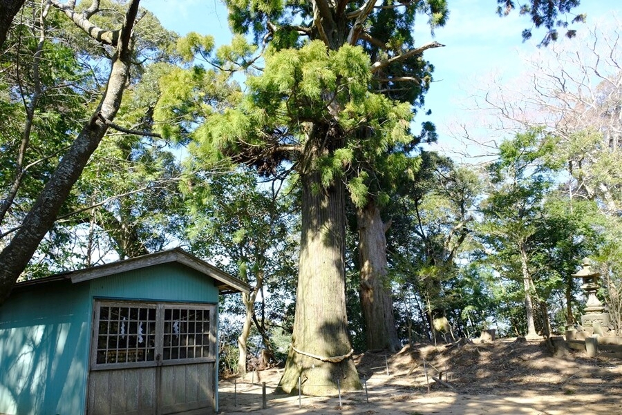 13:05分白鳥神社着。左の建物は御神輿の倉庫、隣にご神木の大きな杉