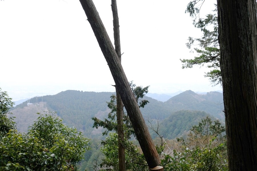 この登りもきつい。頂上手前で妙な切り方をされた木越しに風景が開けた。