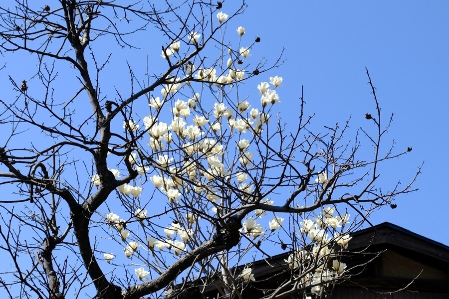 ここから和紙の里まで道路歩き。沿道に春の花。「白木蓮」