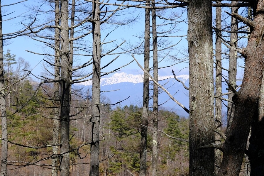 7時半に山荘を出て少し走ると雪山が見えた。右は甲斐駒ヶ岳、左端は北岳だろうか。
