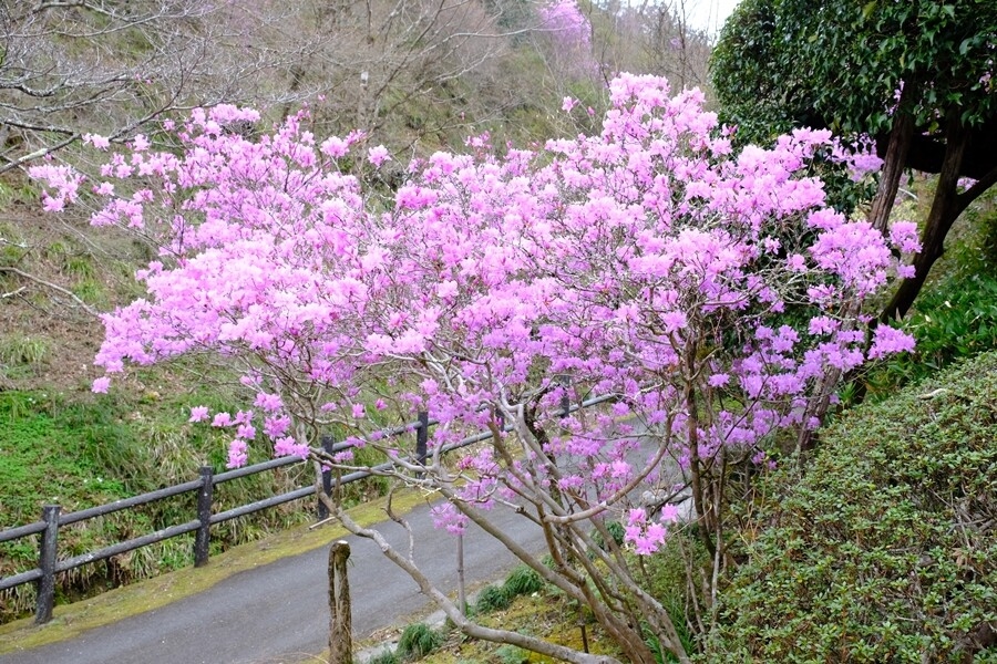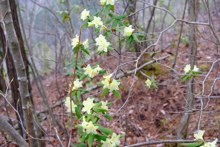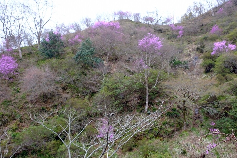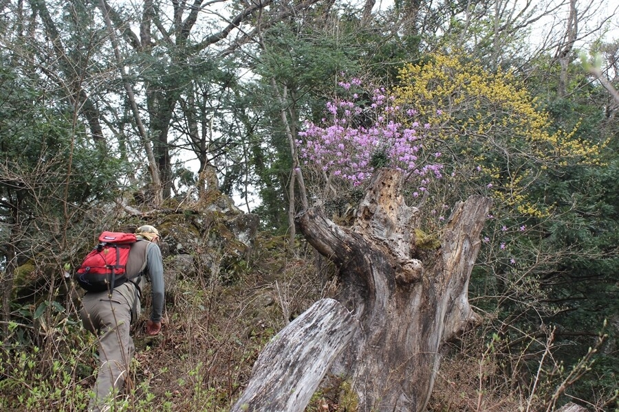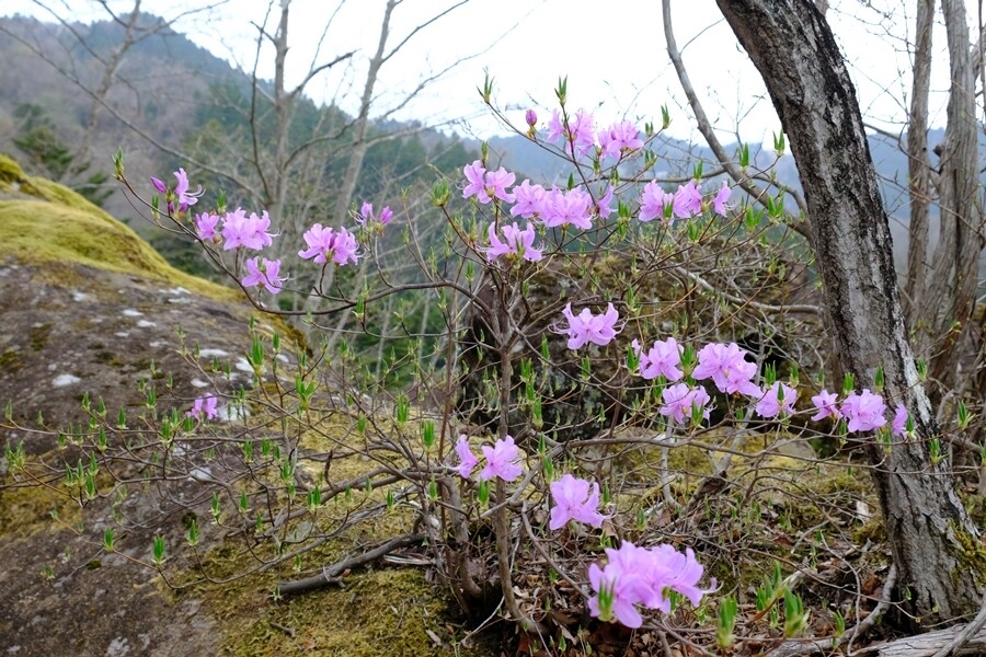 大きな岩の上に出ると、岩にしがみつくようにミツバツツジが