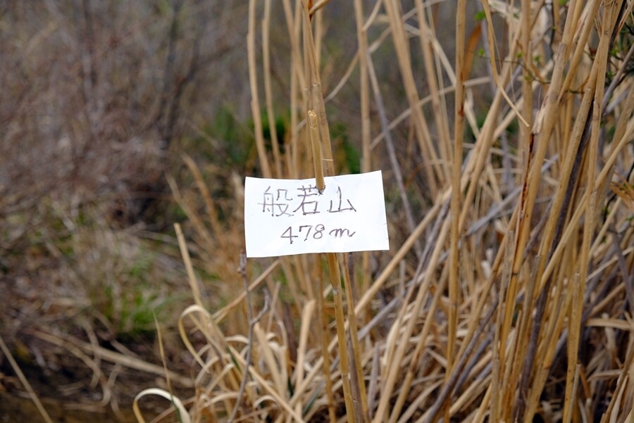 登りきると四等三角点があり、缶ビールで作った表示がカヤに挿されていた。(般若山478m)