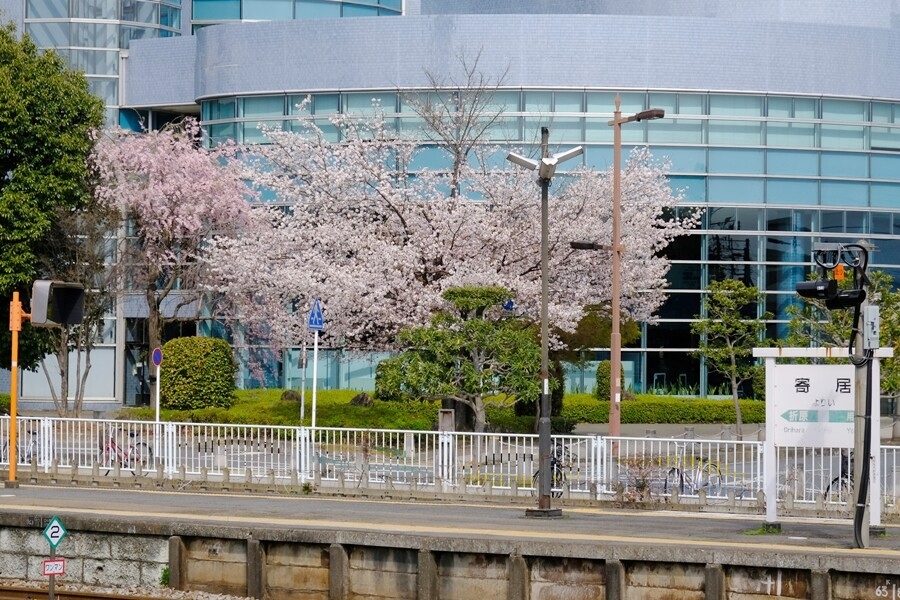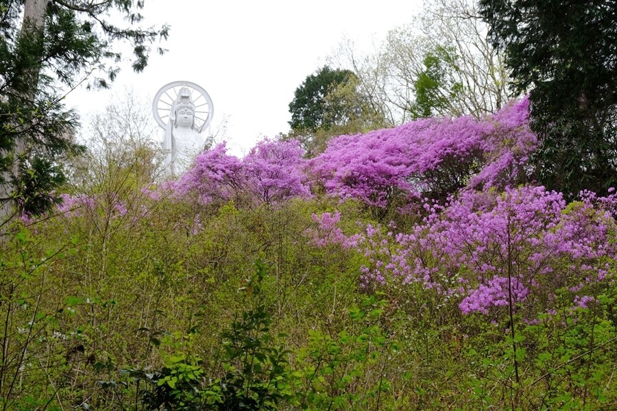 更に進み、線路手前ではっきり観音様とミツバツツジがまとまって見える。