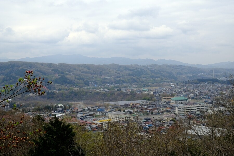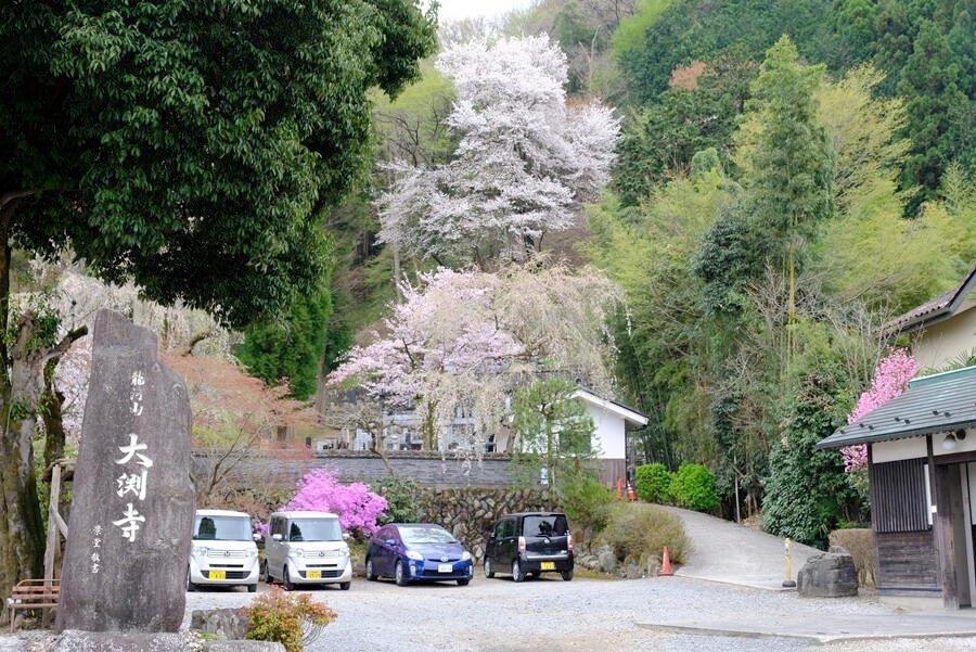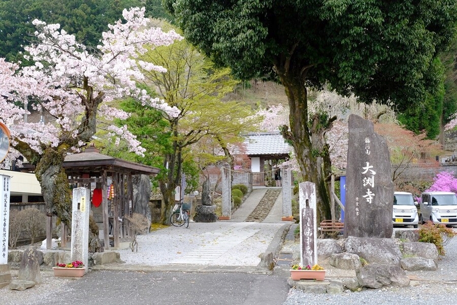 たっぷり花見をして駅に向かう。途中の牧水の滝でダイコンの花と桜