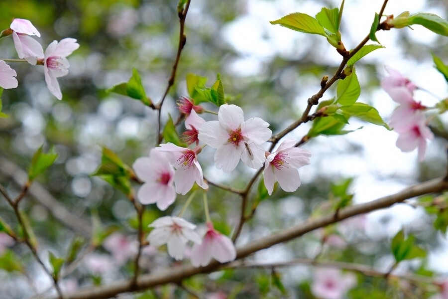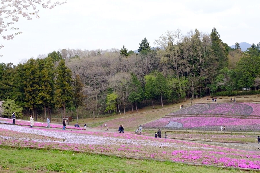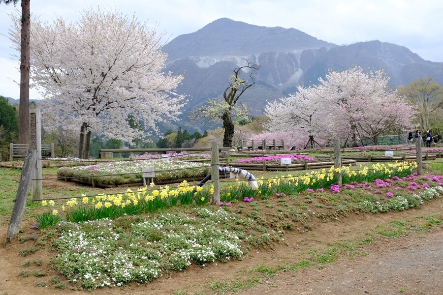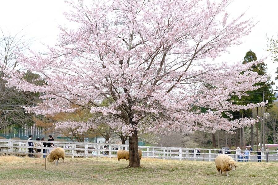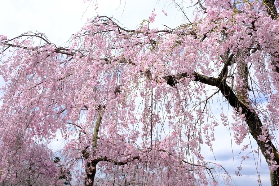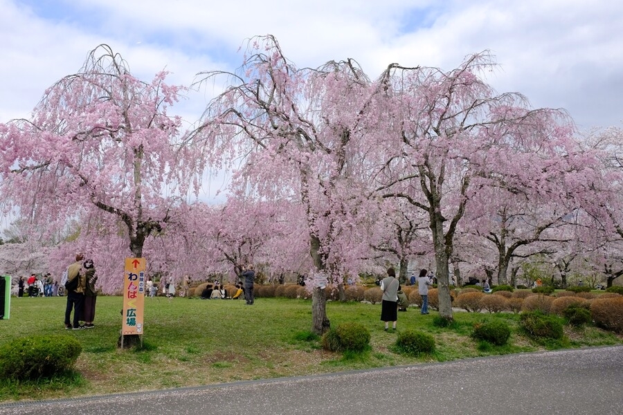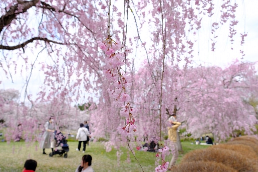 桜のゾーンは枝垂れ桜が満開で桜吹雪が舞っている。
