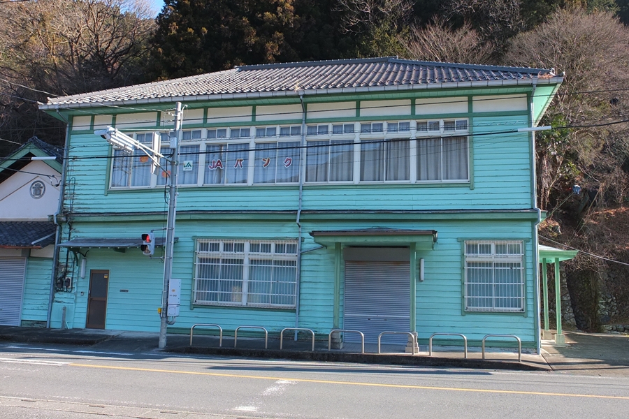 目の前の古い農協の建物が目立つ