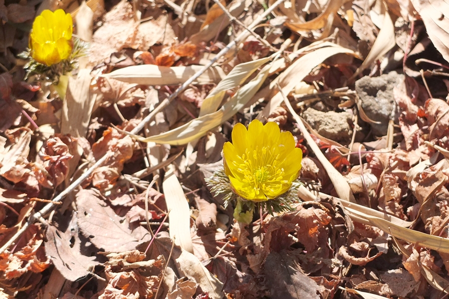 通路に福寿草が咲いていました。気を付けないと踏み潰してしまいそうな場所に