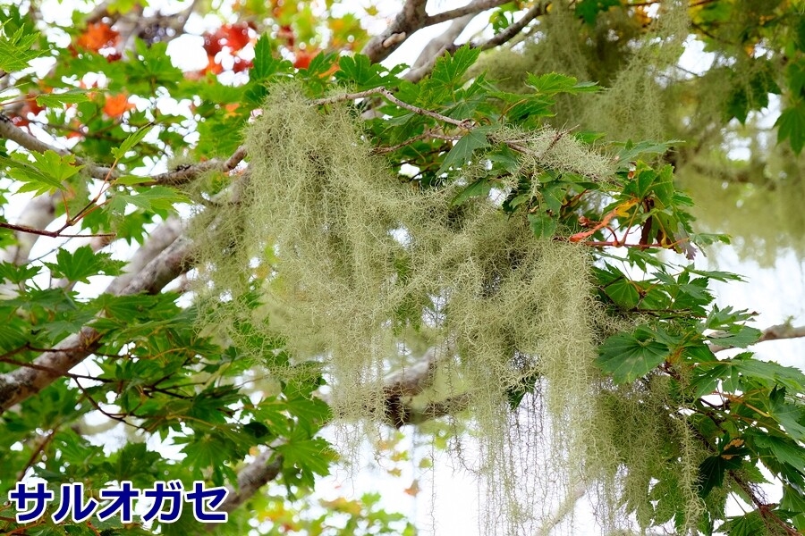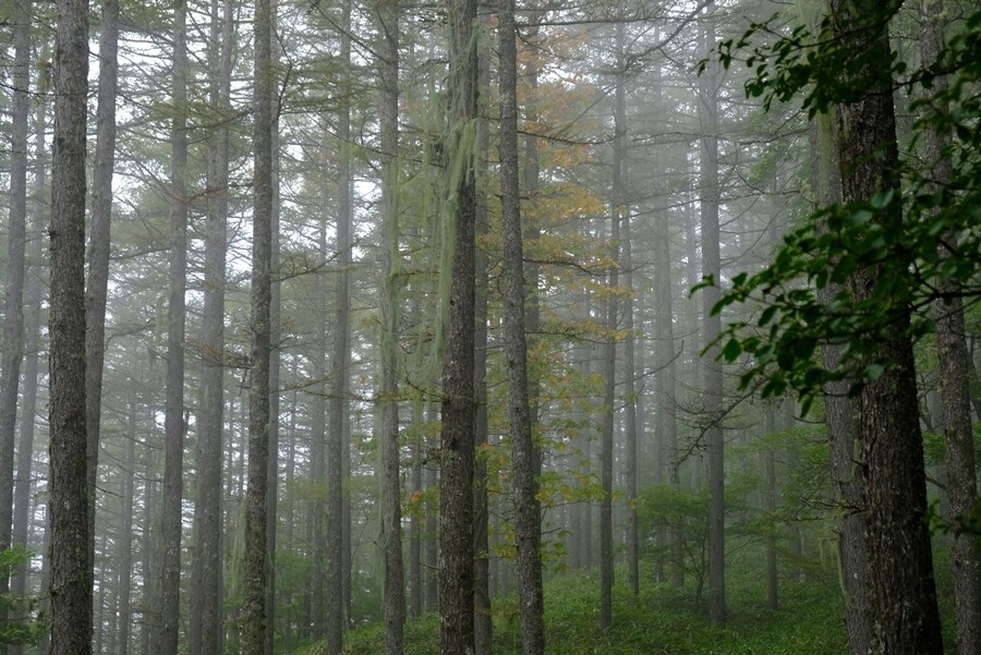 霧の向こうのカラマツにサルオガセがぶら下がっている。