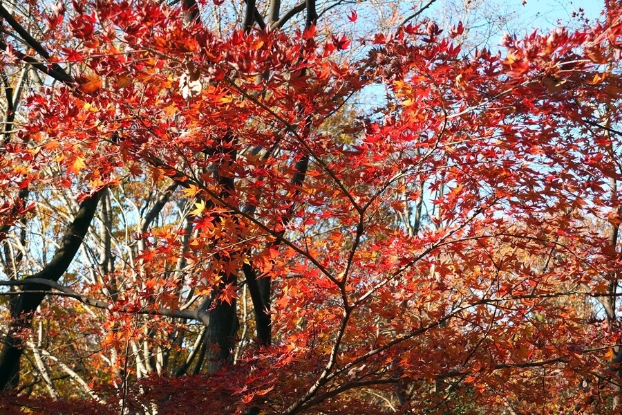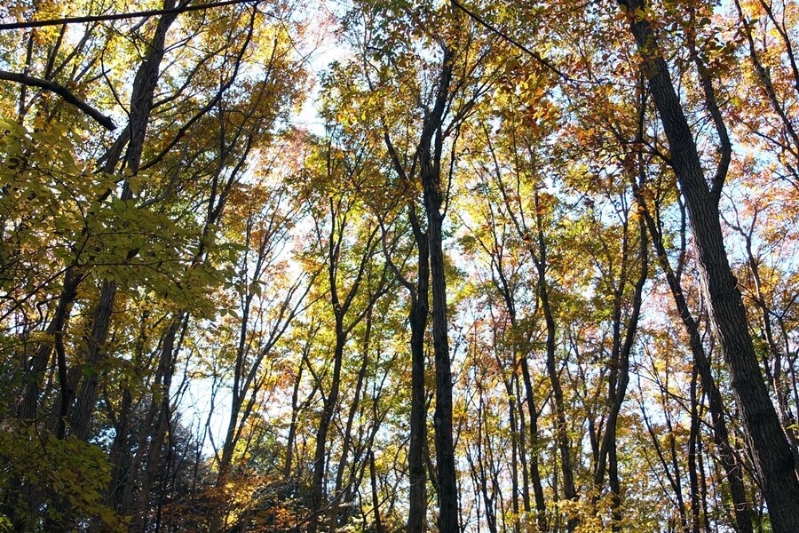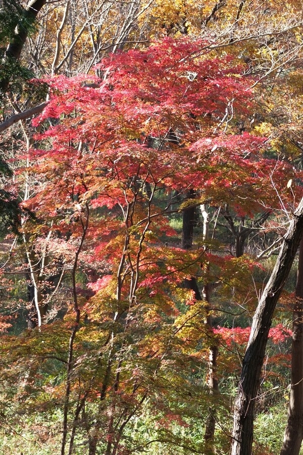 林の中から紅葉を見上げる。