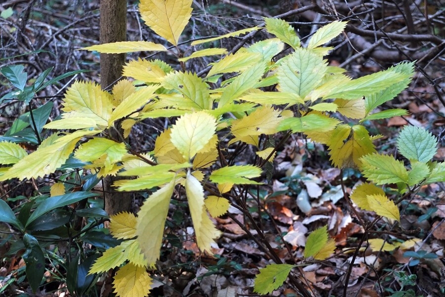 足元にはコアジサイの黄葉