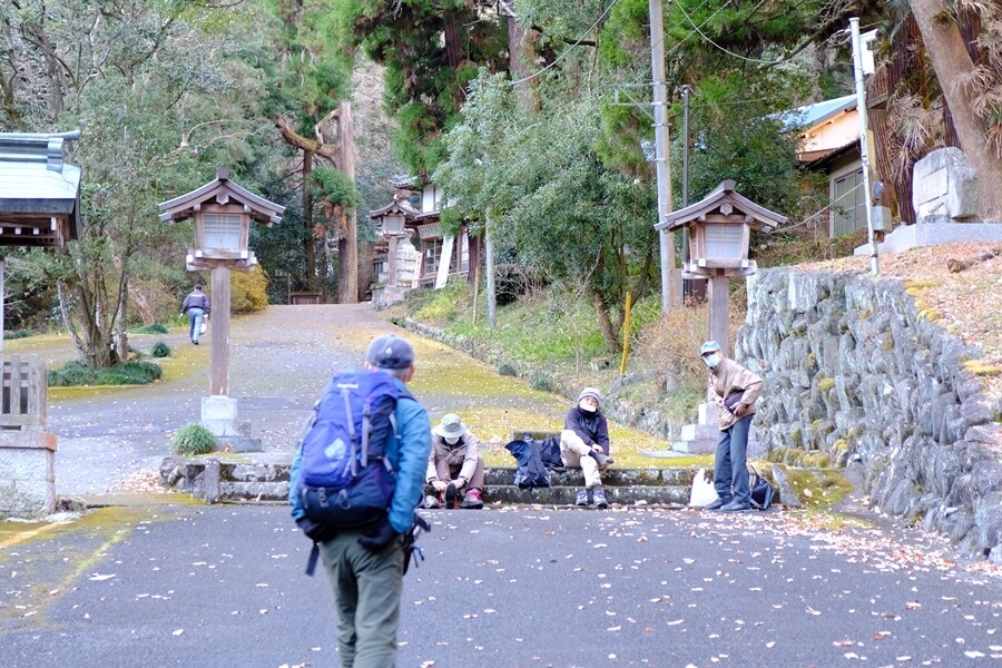 神社への階段で登山靴に履き替える。