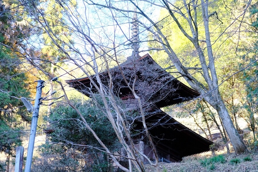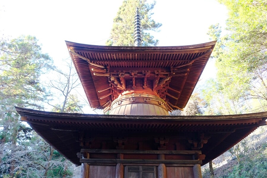 駐車場の隣に多宝塔が見える。