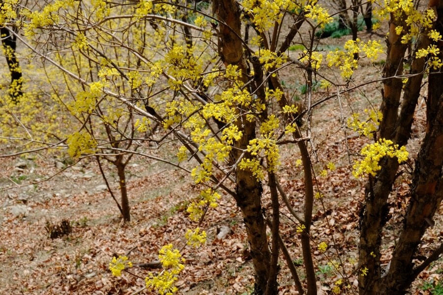 頂上手前で黄色い花を付けた沢山の木がある。遠目に蝋梅のように見えたが山茱萸だった。