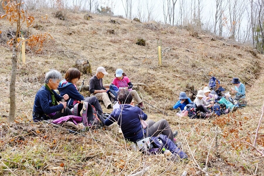あんずの里方面へ下山する途中の開けた所で昼食にした。