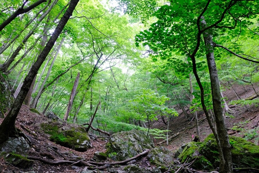 新緑が綺麗だ。もうすぐ尾根に出そう。