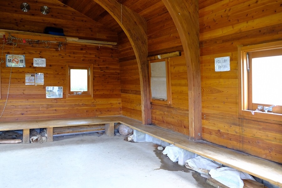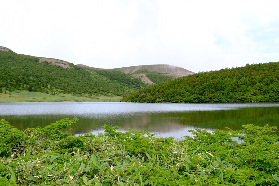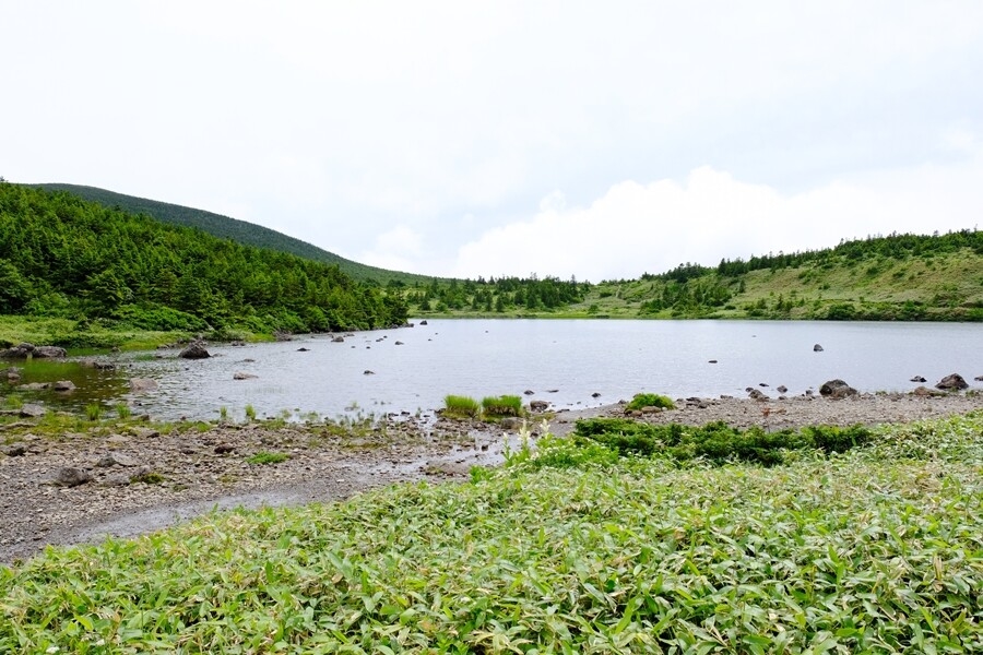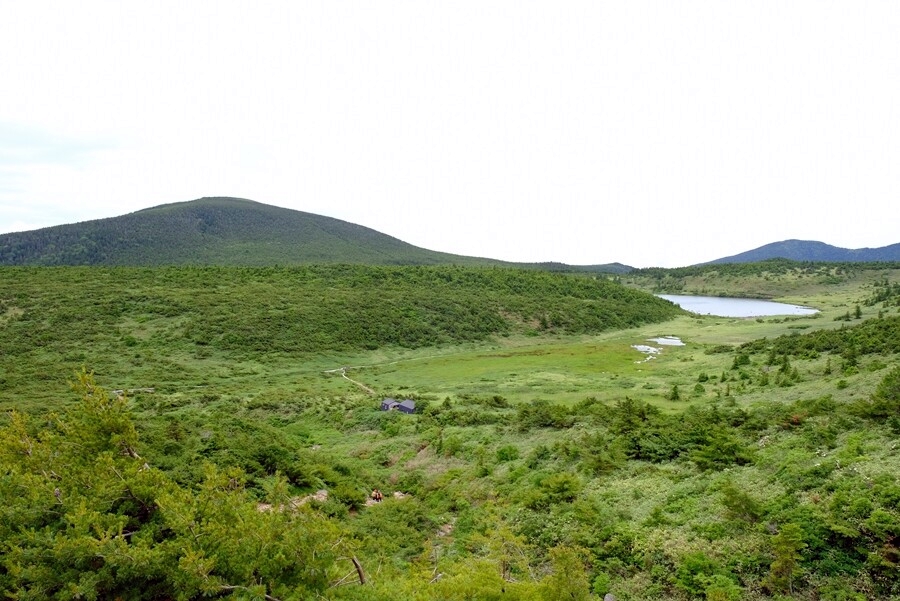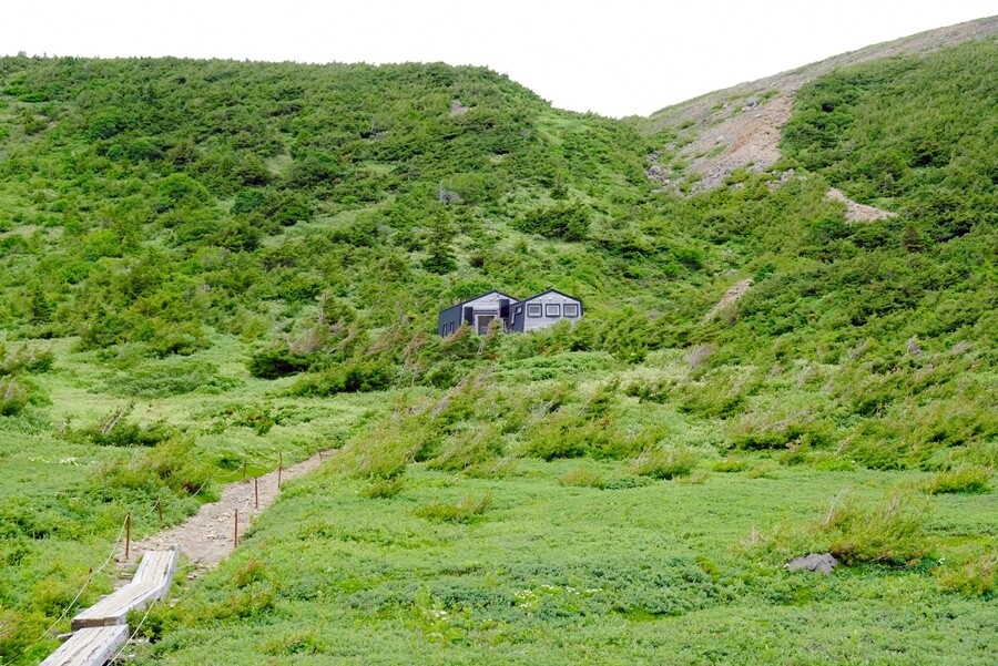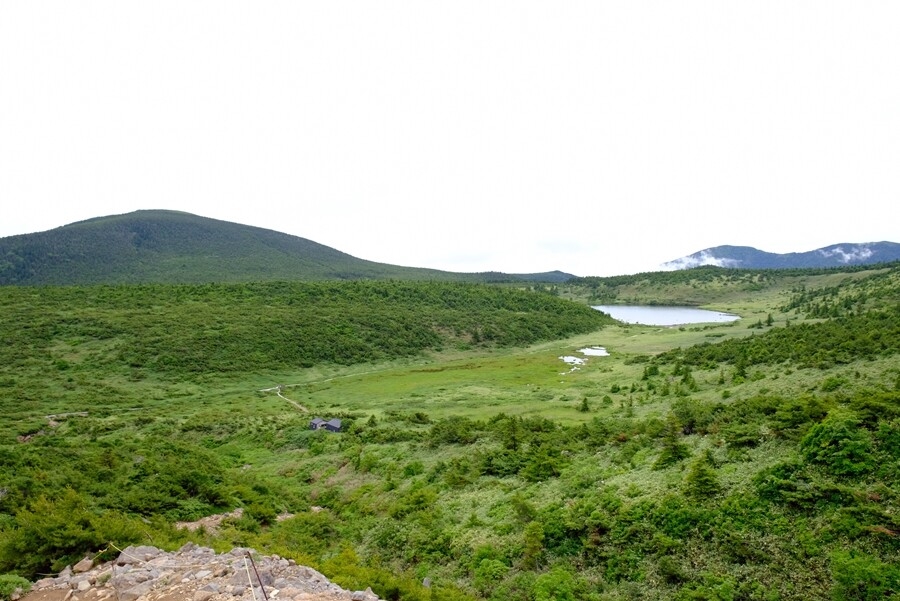 しばらく登ると、避難小屋の向こうに鎌沼を望む。帰りはあそこを通る予定