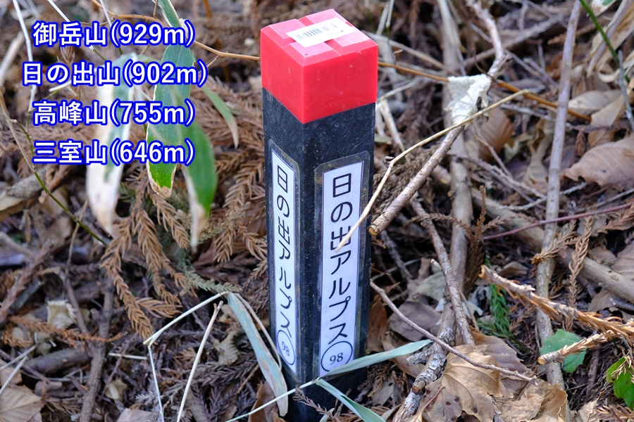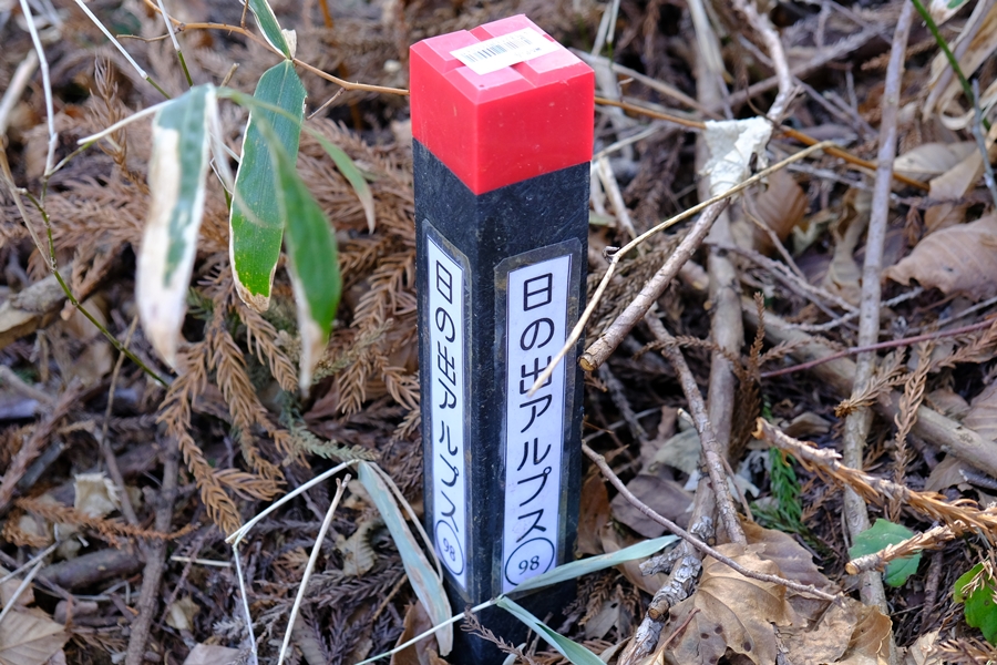 登山道にこのような杭が打たれていて、今日のコースを日の出アルプスと呼ぶらしい。