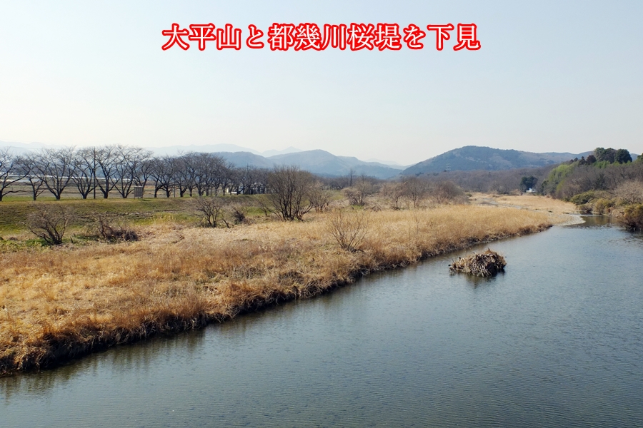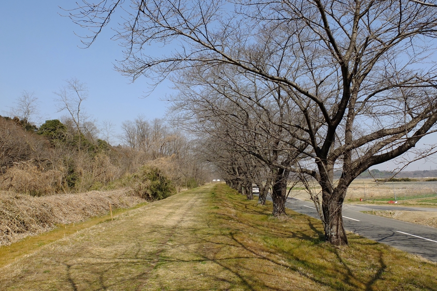 桜堤終点の学校橋から振り返る桜堤と遠くに大平山