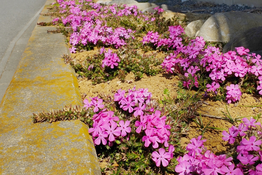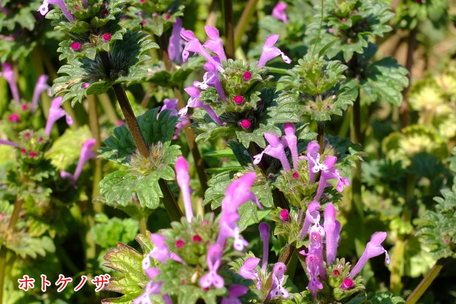 田んぼの脇を進む、春の花がちらほらと咲いている。