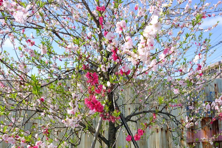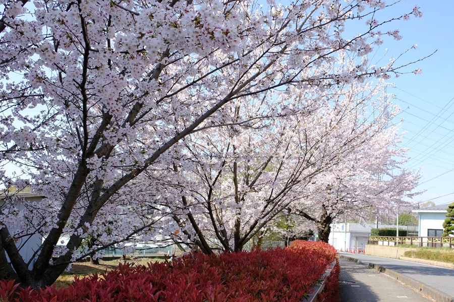学校の生け垣のアカメと桜のコントラスト