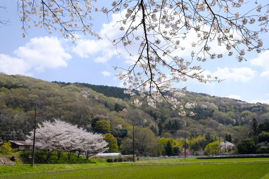 桜の枝越しに対面する山を撮る。