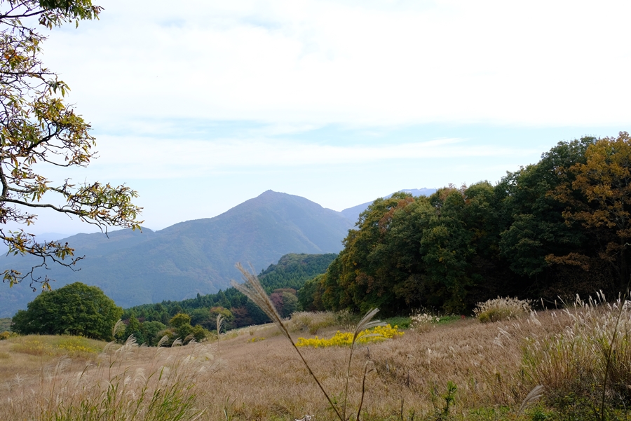 草原に中にセイタカアワダチソウの黄色と遠くに笠山