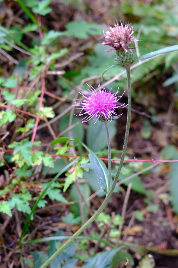 昼食後粥仁田峠へ下る。珍しい花も(アザミと違って葉が違う)
