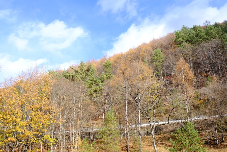 西沢渓谷駐車場からは冬枯れの感じの山にカラマツの黄色が映える