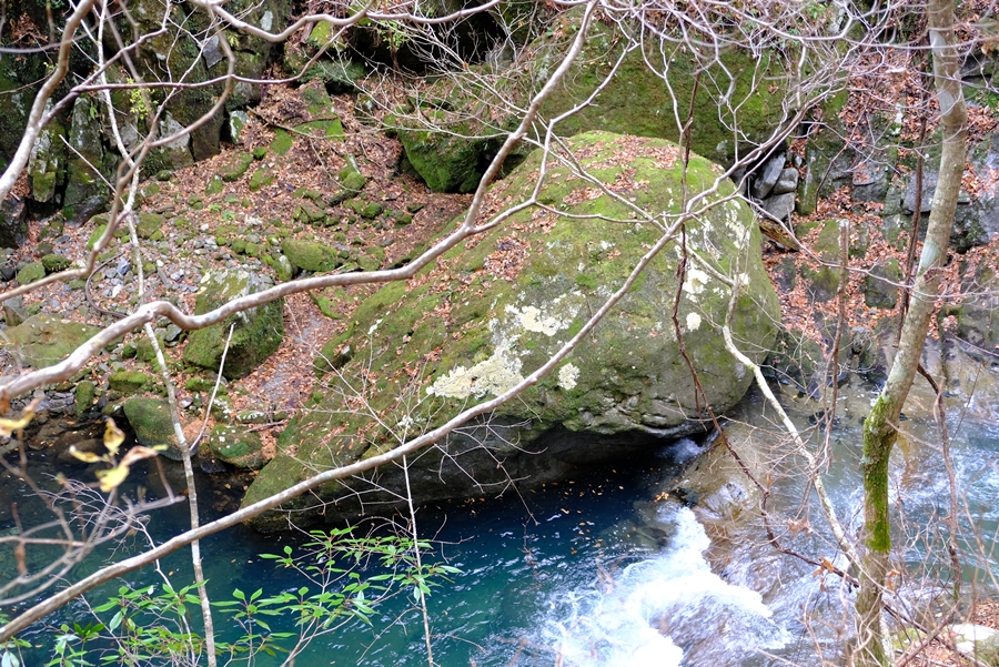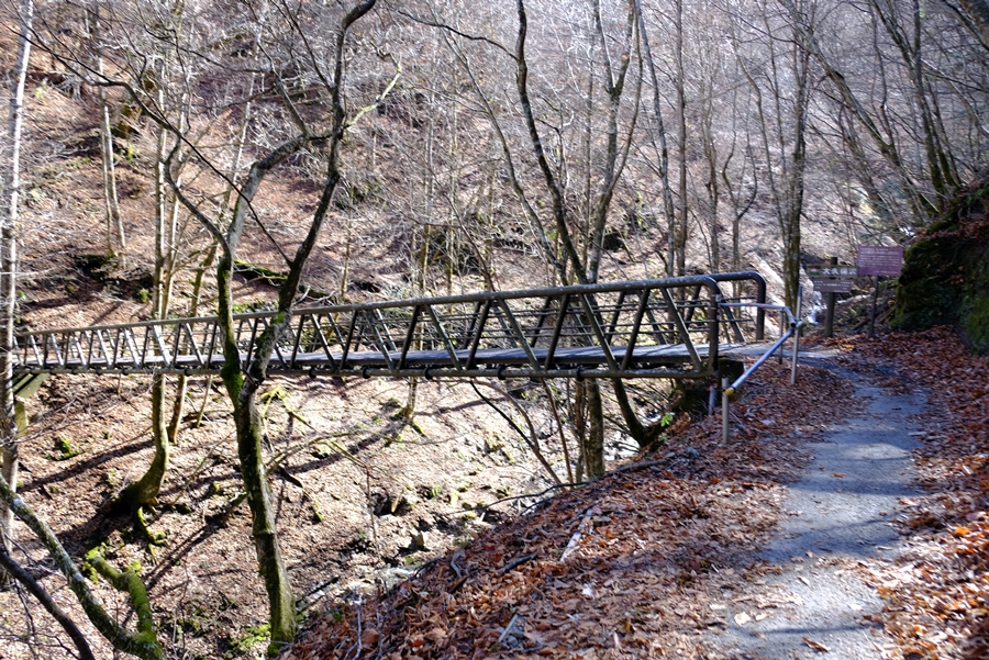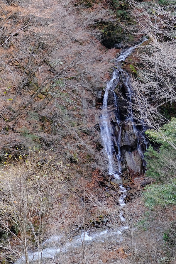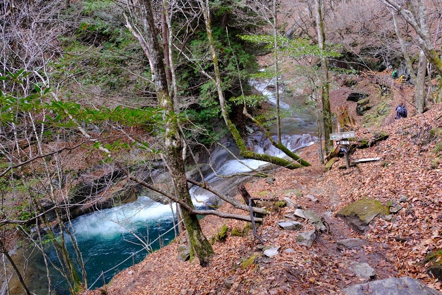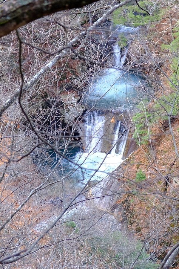 迂回路終点から少し奥に歩いた橋の上から小さく七ツ釜五段の滝を見下ろせた。