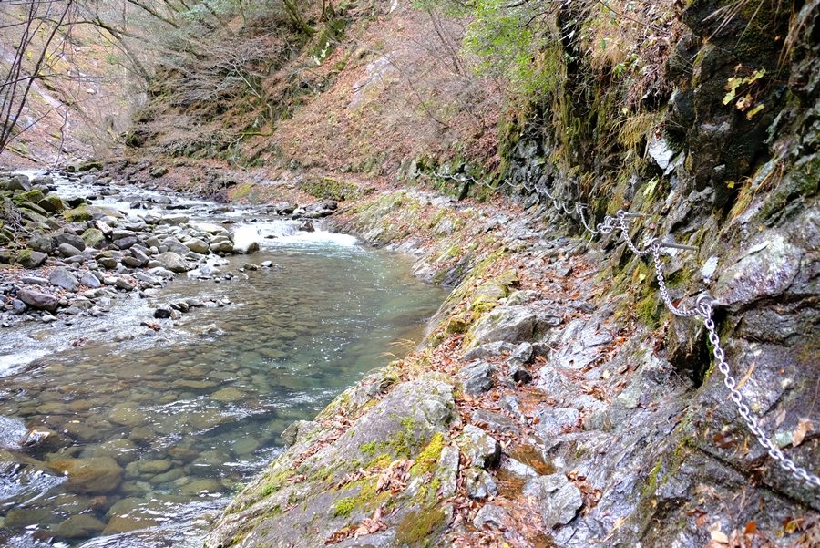 ここからが未知の部分、水際をクサリを伝って進む