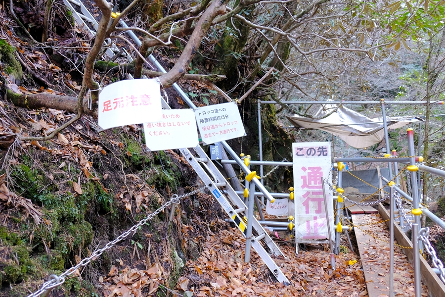 崩落地点通行止めには迂回路が出来ていて、梯子を登っていく。