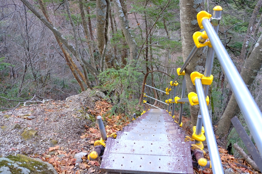 迂回路終点の仮設階段、途中はロープが張り巡らされた急斜面で